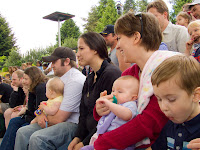 Once we arrived at the stadium we were greeted by an increase in parking prices and a shortage of the free bobble heads. Disappointed, we entered and found our seats. I took Camden down to the railing so he could see the Mariner Moose and the people spraying the field with water. He enjoyed seeing the Moose and all his crazy antics. The game started and Camden enjoyed clapping loudly when everyone else did. We were about 3 minutes into the game when Camden got out of his seat and asked if we could go home. I took him for a walk around the stadium where we saw trains, escalators, drinking fountains, and more seagulls. Several of the people working there gave him baseball cards. He was excited to get those. Grandpa got some popcorn to share and Camden’s favorite kernels were at the very bottom. So each time he would reach to the bottom of the bucket and grab a handful to munch. Greasy greasy popcorn that made his hands wet with butter....he liked it a lot! I tired to get him to try the 'giant pancake' (also known as an Elephant Ear) but he wouldn't try it at all. After a terrifying visit to see the Mariner Moose, we headed home around 9pm.